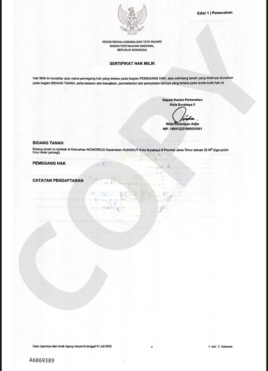 Legalitas Tanah SHM split per unit, sehingga Aman secara Hukum